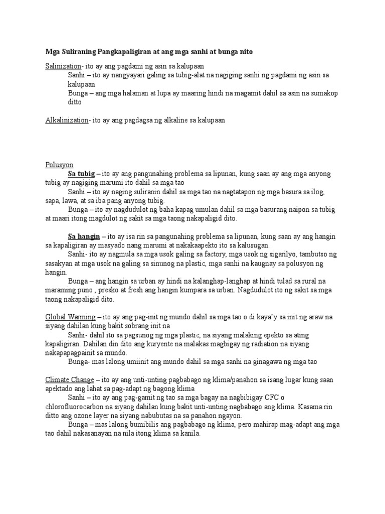 Mga Suliraning Pangkapaligiran At Ang Mga Sanhi At Bunga Nito