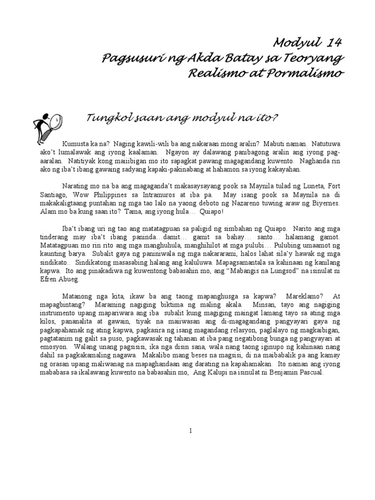 Modyul 14 Pagsusuri ng Akda. Magkakaroon ng interaksyon ang mga mag-aaral at ang guro. 892013 Siya ang nagsulat ng kwentong mabangis na lungsod kung saan tungkol ito sa batang kinokotongan.