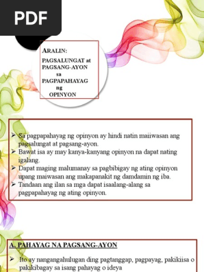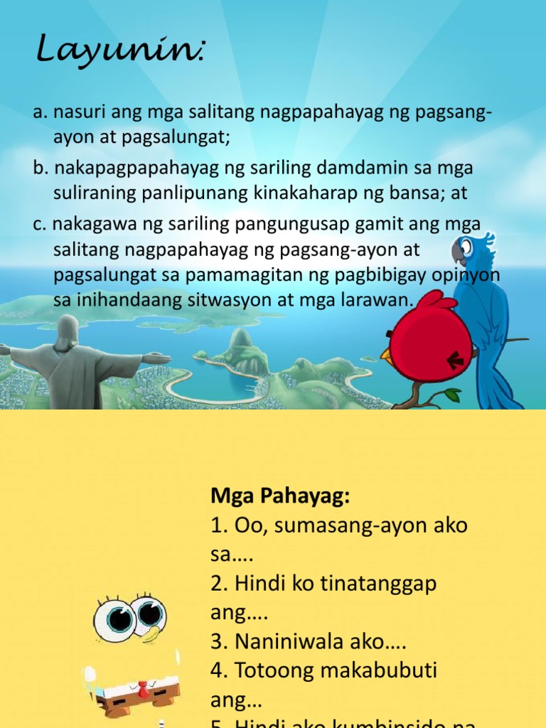 Aug 21 2017 Pag-aralan sa iabab angmga hudyat na ginagamit sa pagsalungat at pagsang-ayon sa pagpapahayag ng opinyon. Sa ating buhay maraming pagkakataon na tayoy nawawalan ng gana. Kumuha ng mga salita mula sa ibat ibang katutubong wika ng bansaHalimbawaHiram na Salita Filipino Imagery -harayaTagalog Husband -banaCebuano Muslim Priest -imamTausug 3.